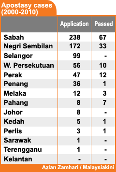 Jumlah permohonan untuk meninggalkan Islam yang terbesar adalah di Sabah – 238, Negeri Sembilan – 172, Selangor – 99 dan Perak – 47.