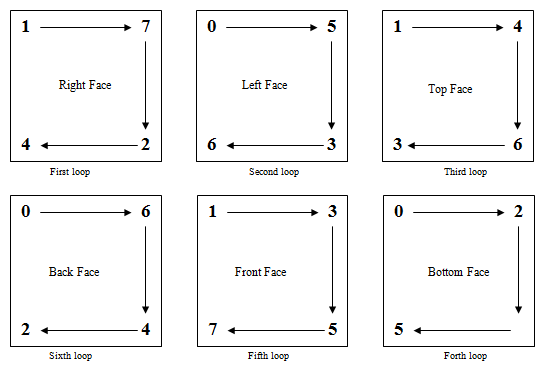 FaceV[0][0] merupakan titik permulaan, ianya akan disambungkan dengan FaceV[0][1] dan FaceV[0][2] dan FaceV[0][3] untuk menjadi satu surface (face)