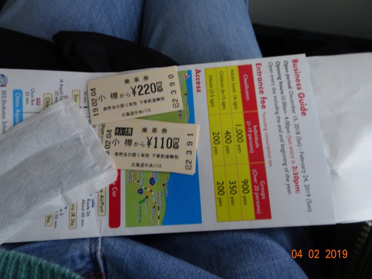 Tiket masuk adalah 2200 yen total dua dewasa dan seorang kanak2 sekolah. Dapat diskaun sebenarnya sebab amik kupon diskaun dekat stesen bas Otaru Station. Pastikan amik ye. Dewasa dari 1000 yen jadi 900 yen.
