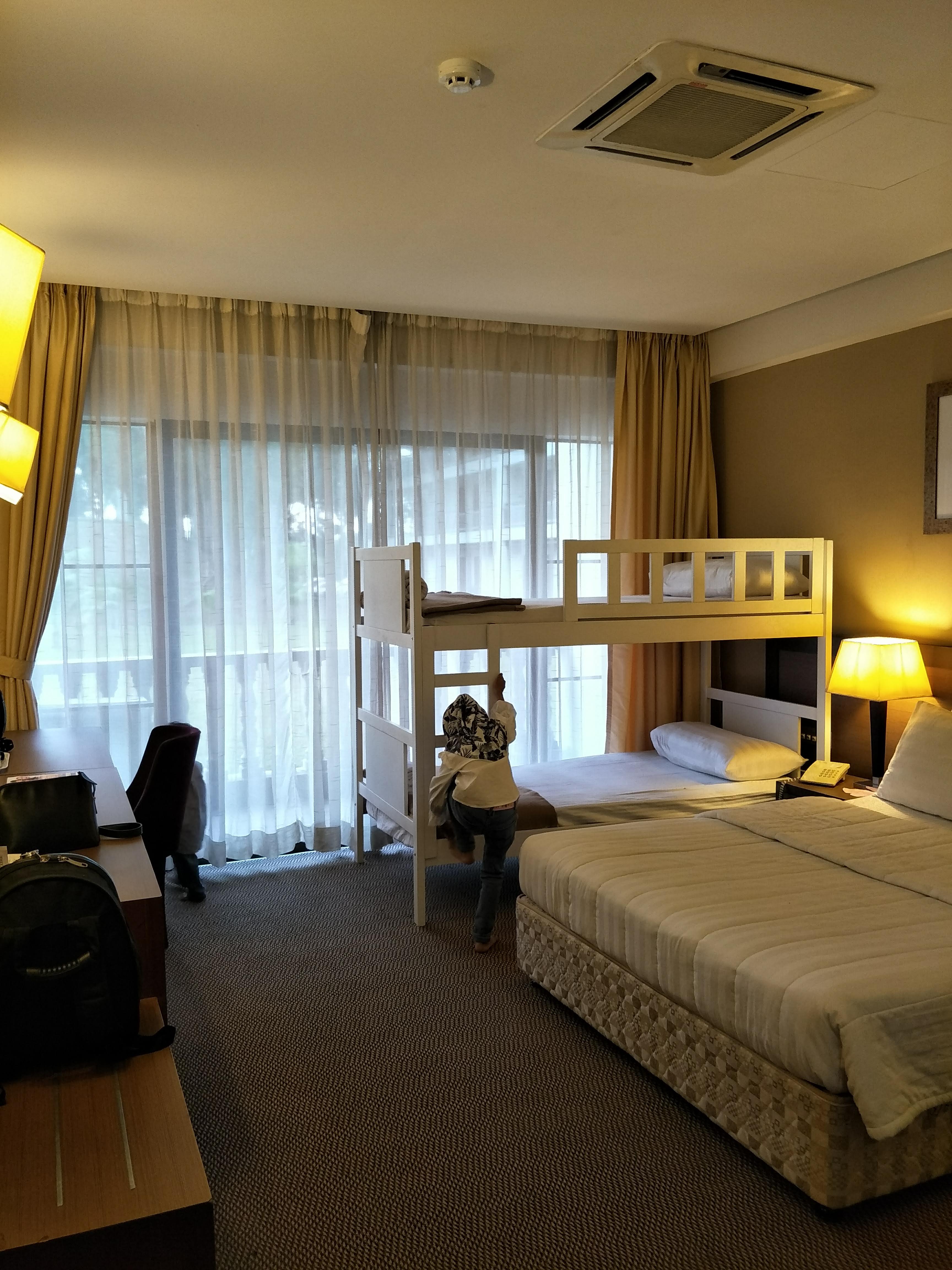 - Bilik dari segi fasiliti bagus. Semua diberikan. Bilik aku ada katil Queen dan satu katil double decker. Bagus