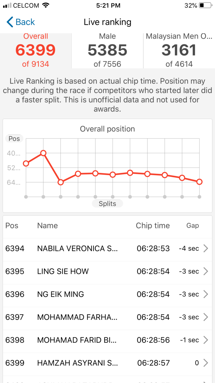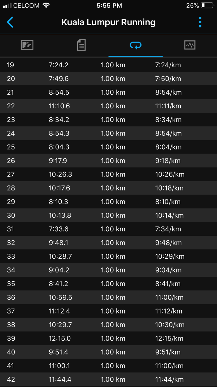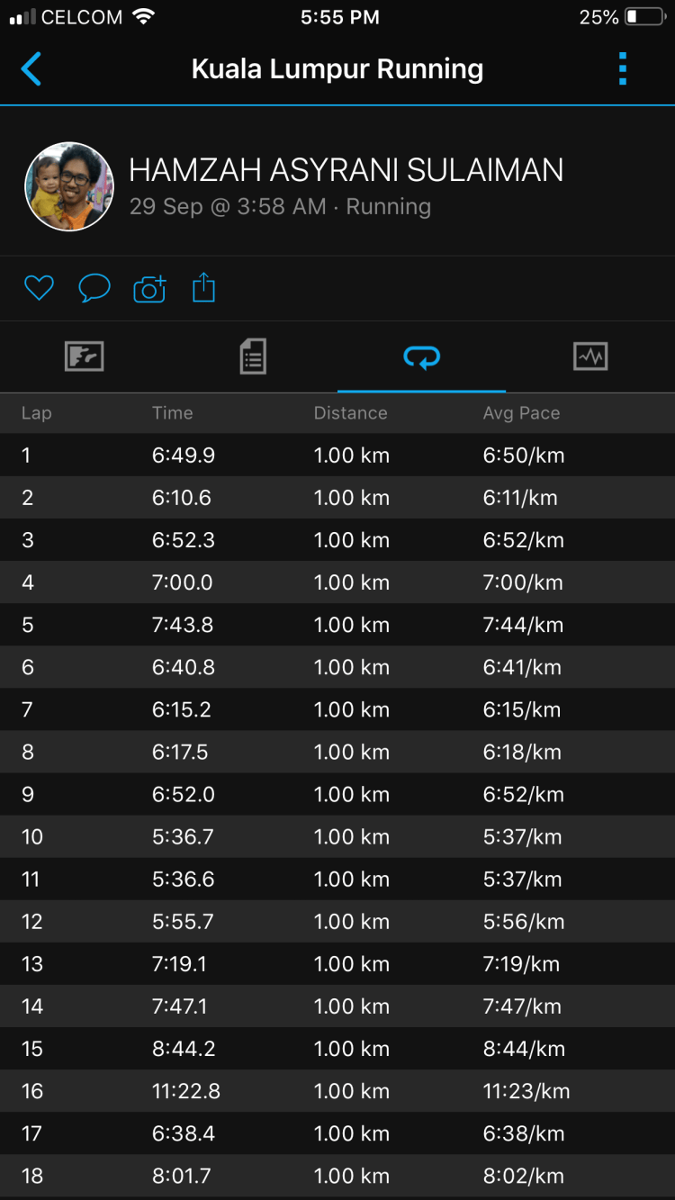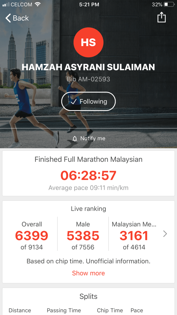 – Ramai beb orang aku pun nak kena tengok org if nak potong ke ape. Kesudahannya mmg aku pace 6-7 ajela dan aku cuba simpan tenaga untuk km2 berikutnya. Penuh jalan beb siap hujan renyai lagi. Time ni aku mcm yakin je tamat dalam 5 jam