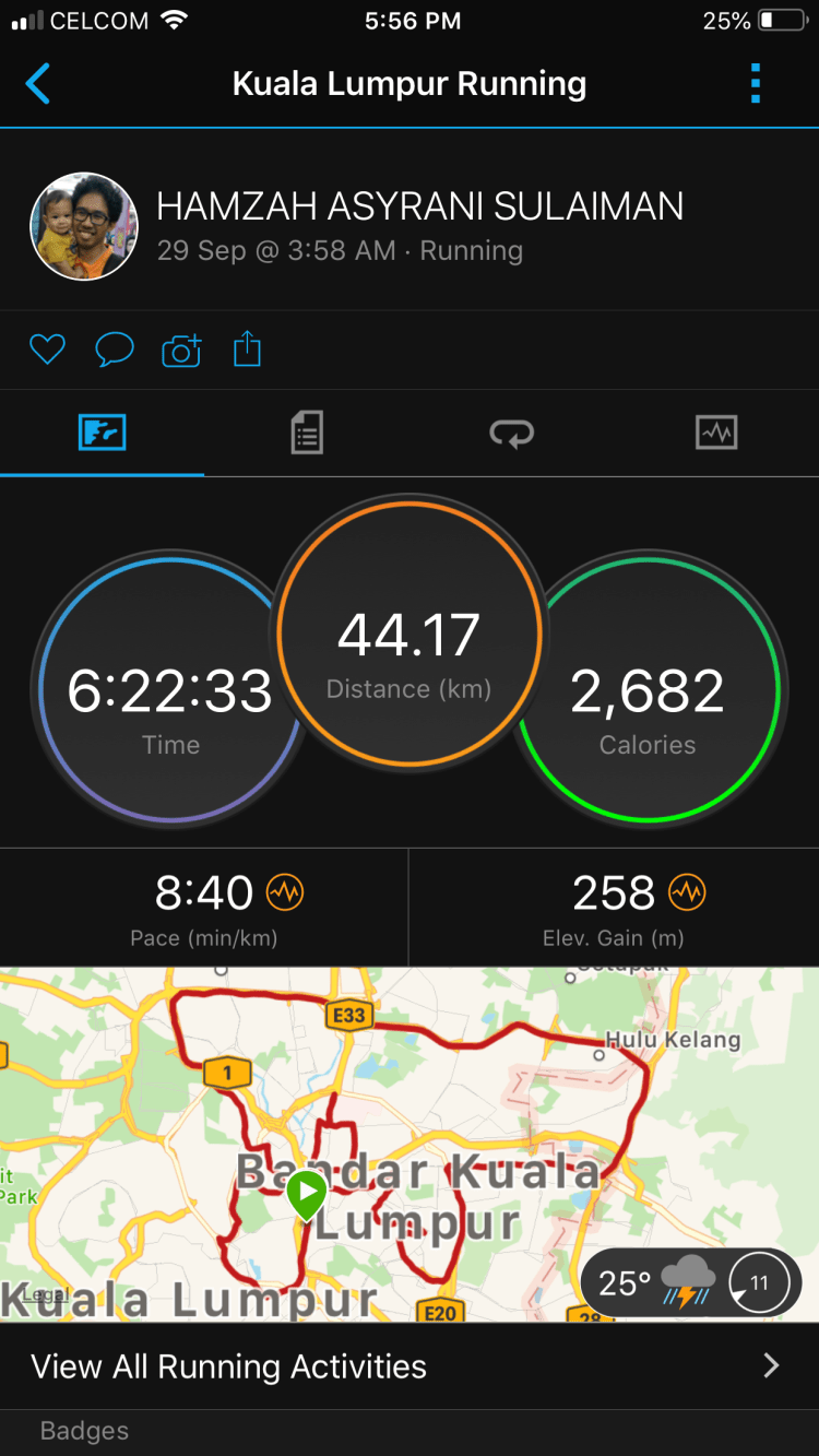 – ini part wakkakakakaka. Jalan itu adalah tujuan utama. Total lari dalam 100meter aje kot per km. Start km ke 35 aku hentam jalan aje. Ya mmg jalan.