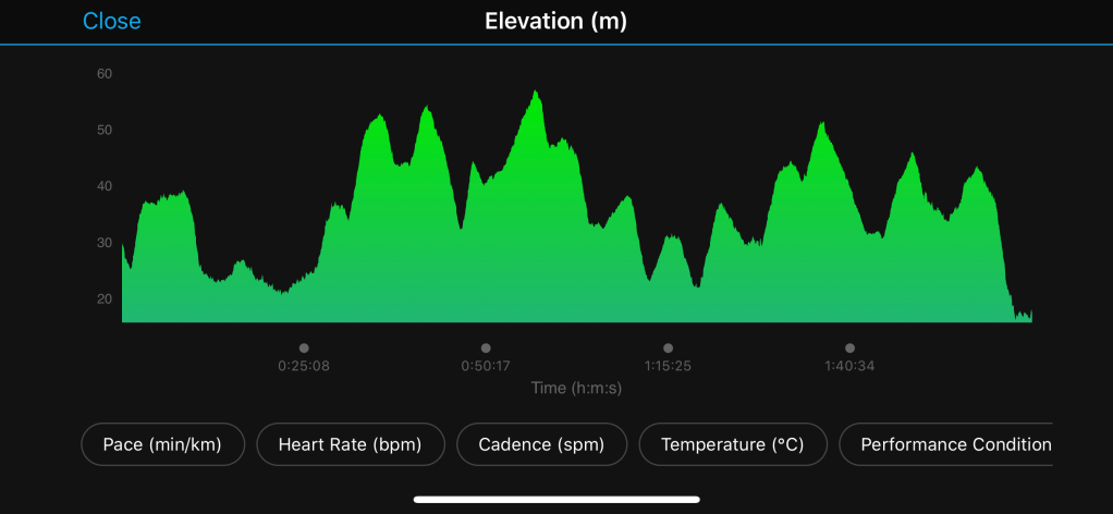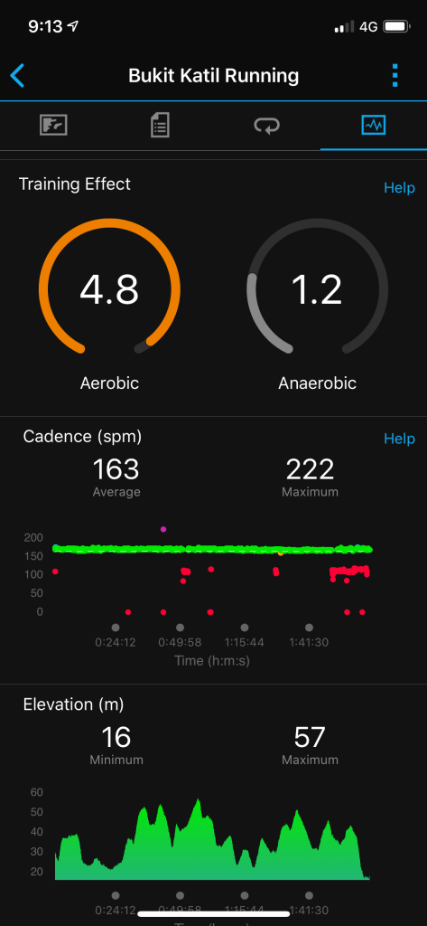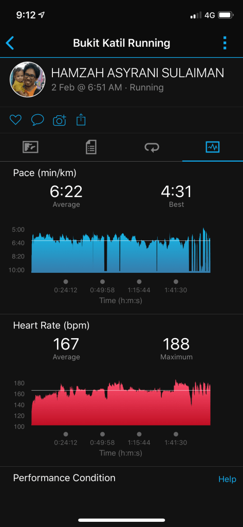 Sekitar 10 km agak baik dan seterusnya 5 km juga agak baik. Memasuki fasa km ke-17 mula mental memainkan peranan untuk menghalang motivasi saya untuk pergi lagi. Maka sekitar lagi 3 km bermula episod berjalan dan berlari. Pace menjadi sekitar 7 dan pada km ke 20 menjadi 6 kembali.