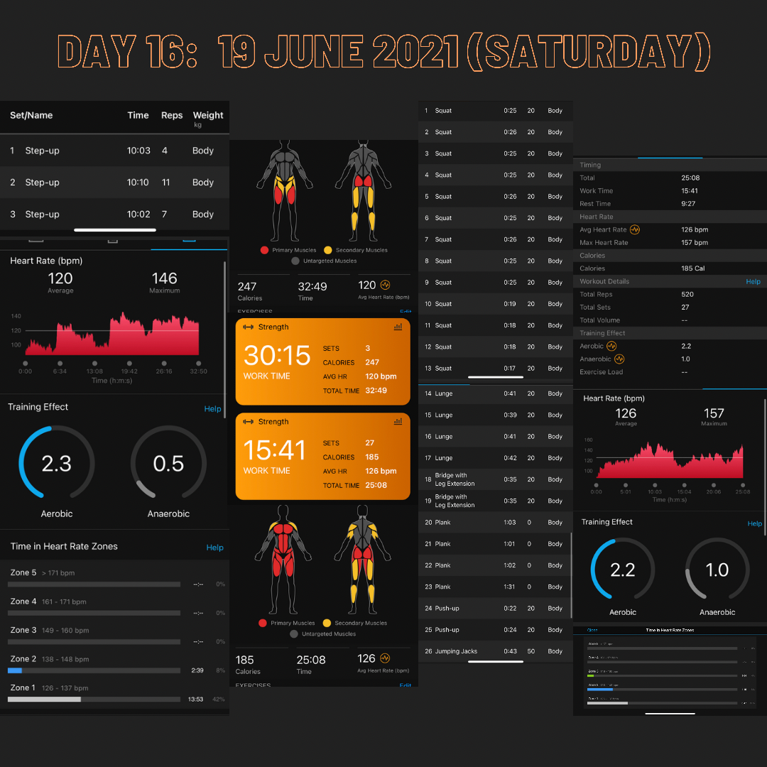 21 June – Day 18 – Managed to get my HR a little bit higher 1 HR:123 but my Step Up training using Reebok Step Board pulak yang rendah HR (so next time kene harder lagi). Today managed to do: 450 squats (30×16 set), 20×4 lunges, 20×2 bridges, 1minx4 plank (yg last buat 1:30, push up 20×2 set and then jumping jacks 50×2. Continue dgn Step Up Workout 10minx3. Dan diselitkan Box Jump semasa membuat step up tu dalam 10 times setiap set. Maybe lepas ni nak add every 2 minutes akan selit 10 times box jump kot. Total time workout today is 1 hour.