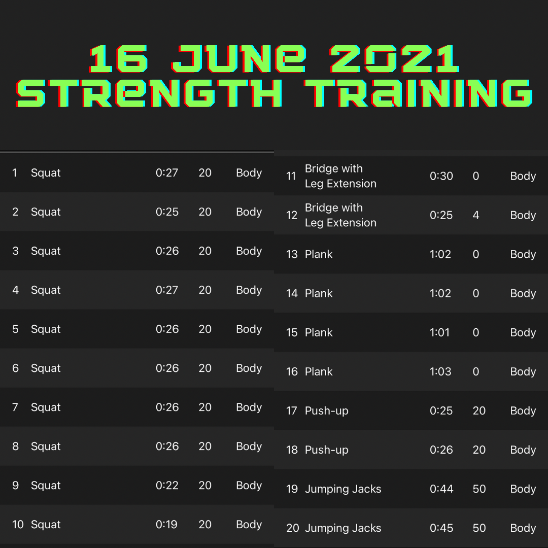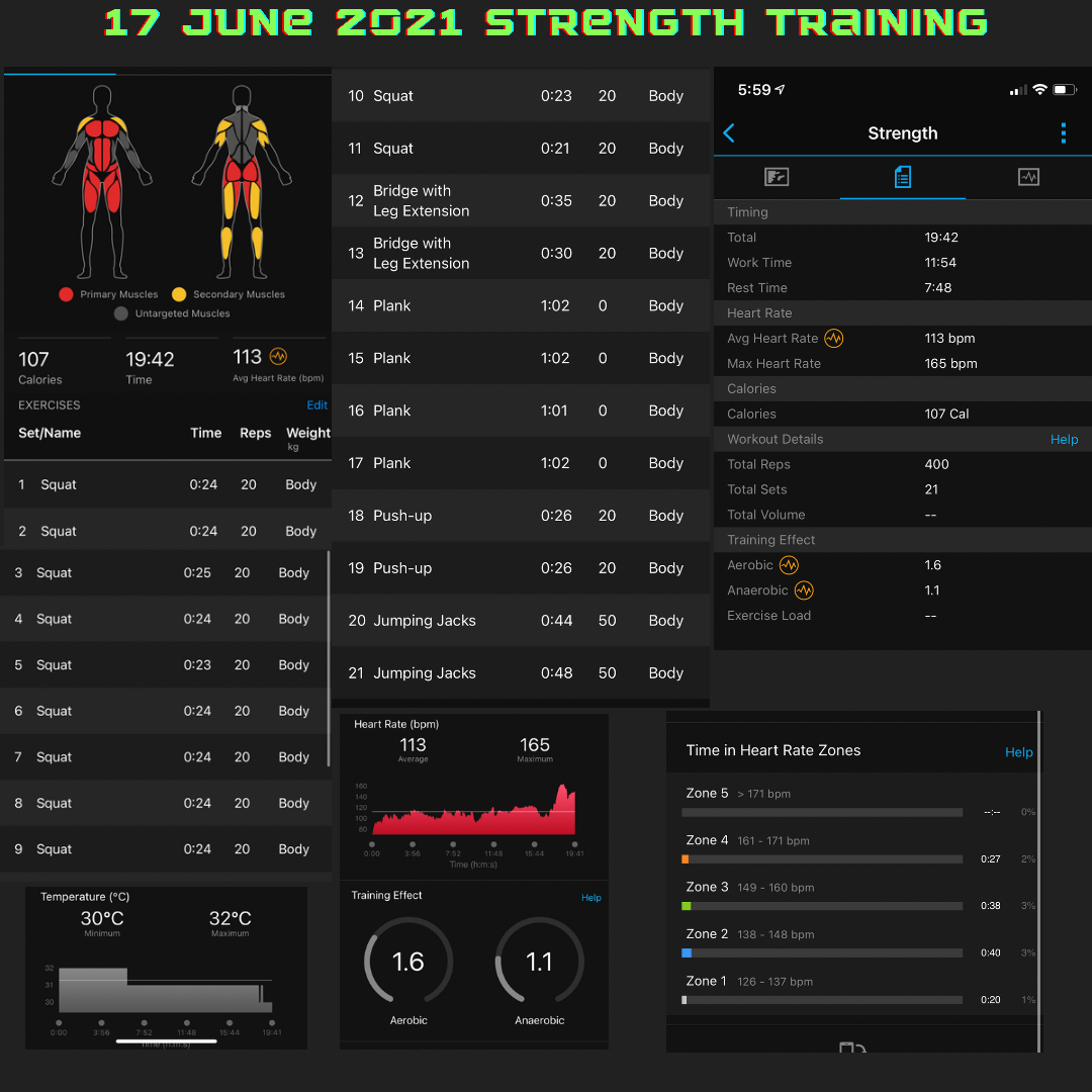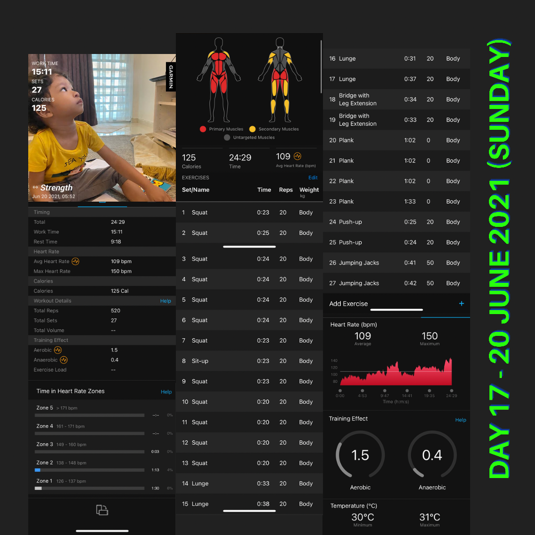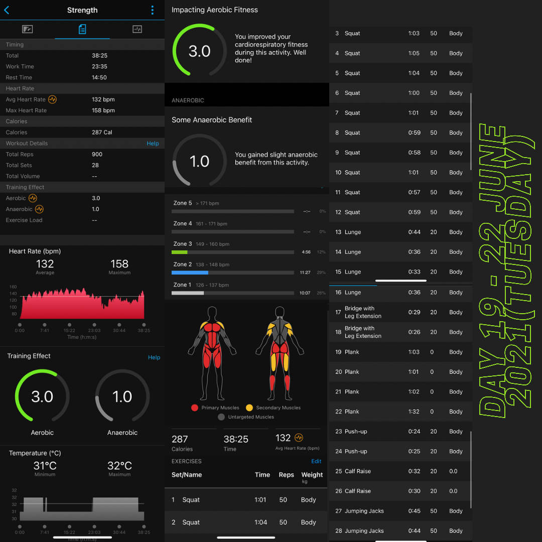 22 June – 50×12 (600 squats), plus lunges, bridges, calf raises, planks, pushups, and jumping jacks. Baru HR diuji dan Aerobic at level 3 (ada peningkatan dan benefit). #fenix5splus #garmin #homeworkout #workout