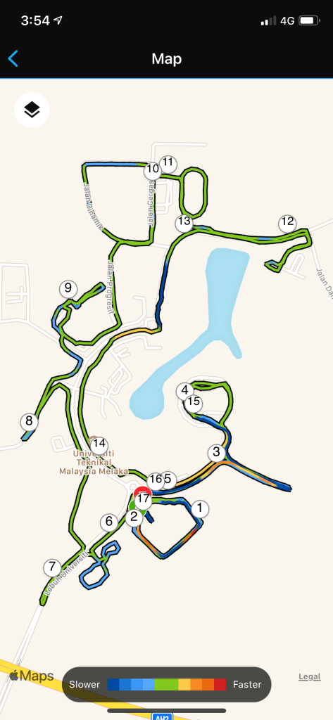 Kemudian lagi 1.9 km aku cool down jalan aje sebab dah penat and panas beb cuaca. So aku just run walk aje beb penat gile dah 15km maintain average pace time tu 6:20 begitu. Hahahah. So bile lagi 1.9km disebabkan aku jalan so average yg betul adalah 6:44/km. Hehehe
