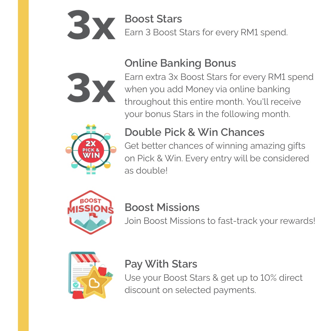Aku mmg dah dua tahun guna boost ni. Berbanding TnG E Wallet yang fokus kepada penggunaan tol, boost ni banyak faedag terutama bab aku nak bayar bil dan shopping kat mall. Sebab dia ada dpt stars dia ni. Dulu kaedah dia lain dpt “points” tp skg diubah kepada dapat stars”. So kumpul stars ni dapat lah macam2 reward tukar mcm voucher RM15/RM10/RM5 atau pun majoritinya if spend some amount kat Mydin ke, Lotus ke dpt balik cash back bentuk voucher dia. Banyak kali Mydin contohnya dpt RM10 balik duit untuk digunakan next time purchase.