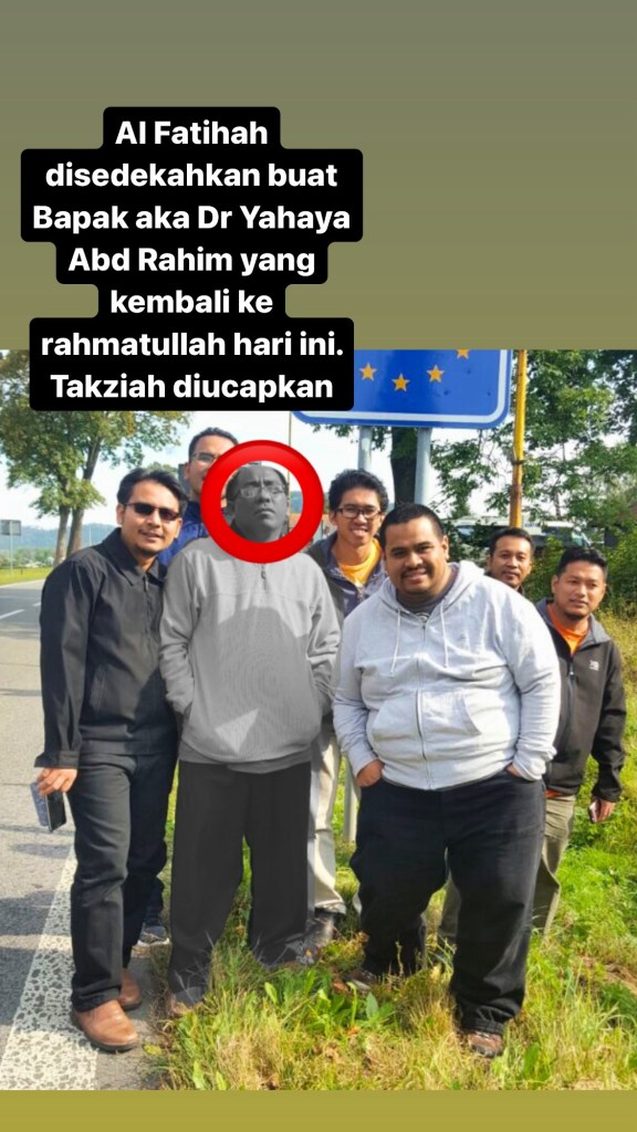 Al Fatihah diucapkan buat Dr Yahaya Abd Rahim (kitorang panggil panggilan Bapak) yang telah meninggal dunia hari ini. InsyaAllah akan dikebumikan di Johor selepas dibawa solat jenazah di Masjid TTU dan Masjid UTeM.