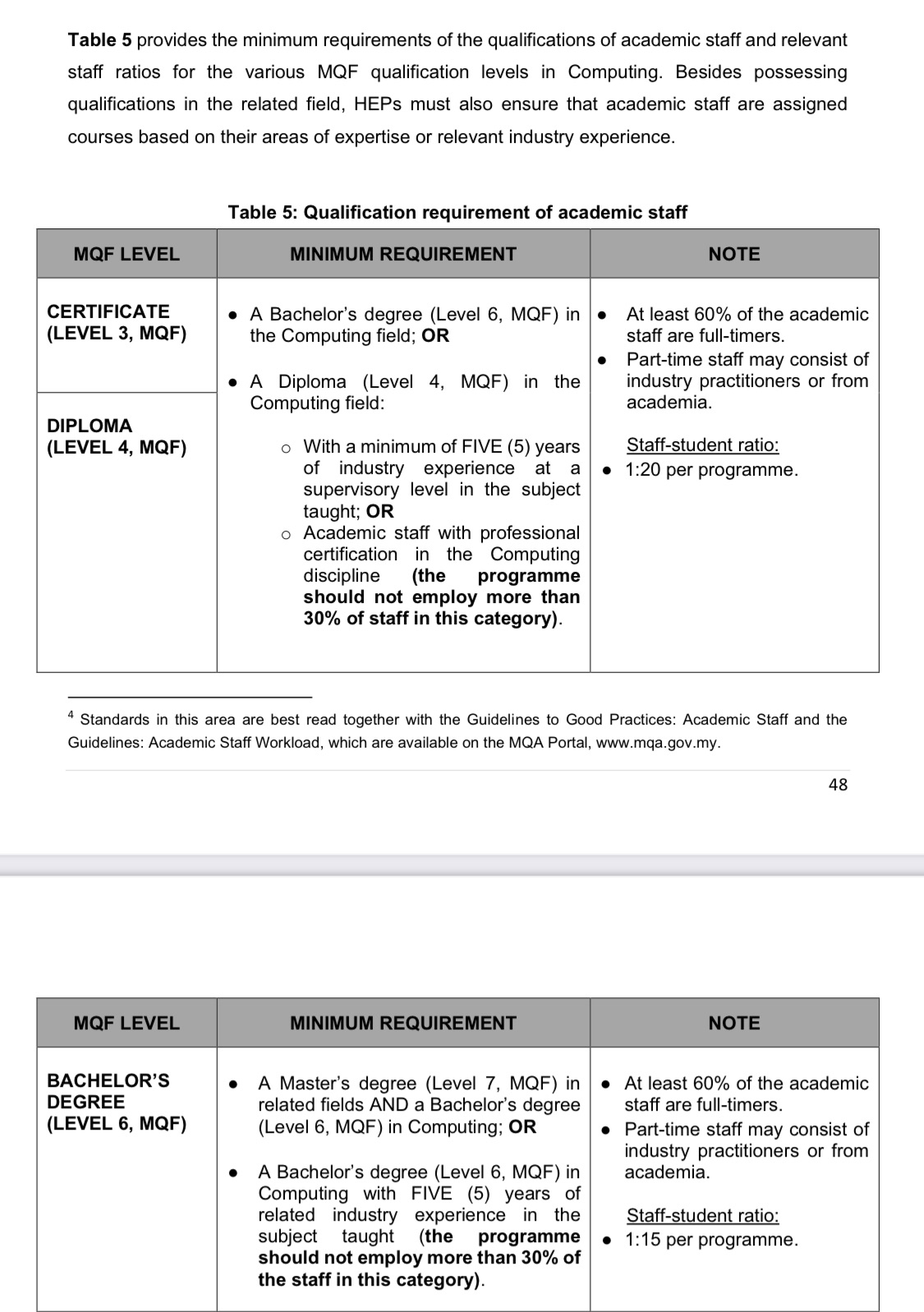 MQA dah tetapkan syarat baru yg staf mesti Bachelor Degree dalam bidang computing untuk mengajar pelajar dalam bidang computing. Jika tidak mereka tak boleh ajar subjek2 berkaitan computing. Tu ramai yang Technical Knock Out masa nak apply pensyarah tu terutama fakulti yg berkaitan computing.