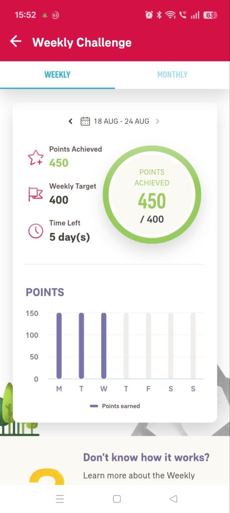 Dia sebab ade weekly challenge ni yg membolehkan ko kumpul certain point untuk reach some target. Target max adalah 400. So basically if ko dah meet the criteria sehari ko dpt 150 points. So tiga kali berlari dah dapat 450 points.