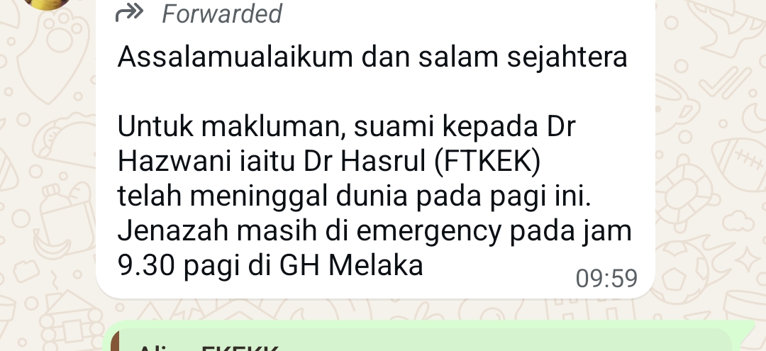 Terkejut aku pagi ni. Dr Hasrul ni kitorang pernah sewa serumah pada 2009/2010 macam tu. So aku kenal la sebab dia pun FKEKK dulu (sebelum berpecah jadi FTK and kemudian sambung balik jadi FTKEK). Arwah difahamkan meninggal dunia sebab jantung. Serangam jantung selepas sahur. Dan difahamkan ada sejarah jantung and pakai stent. Selamat berehat sahabat,Continue reading “Selamat Berehat Sahabat”