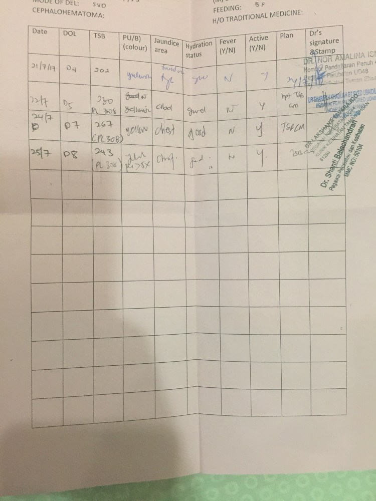 - Pada hari keempat iaitu 21 July, bayi ada kuning dan bacaannya adalah 202. Kemudian diikuti pada hari 22 July pula 230. Ada peningkatan sedikit tetapi bayi menyusu bagus dan berak bagus.